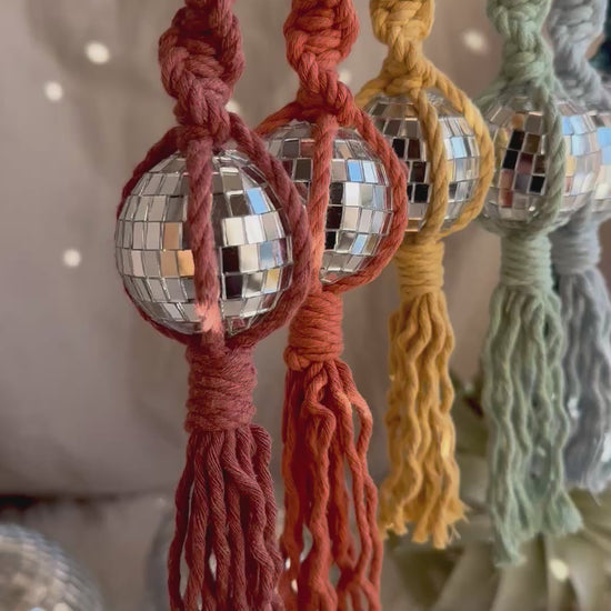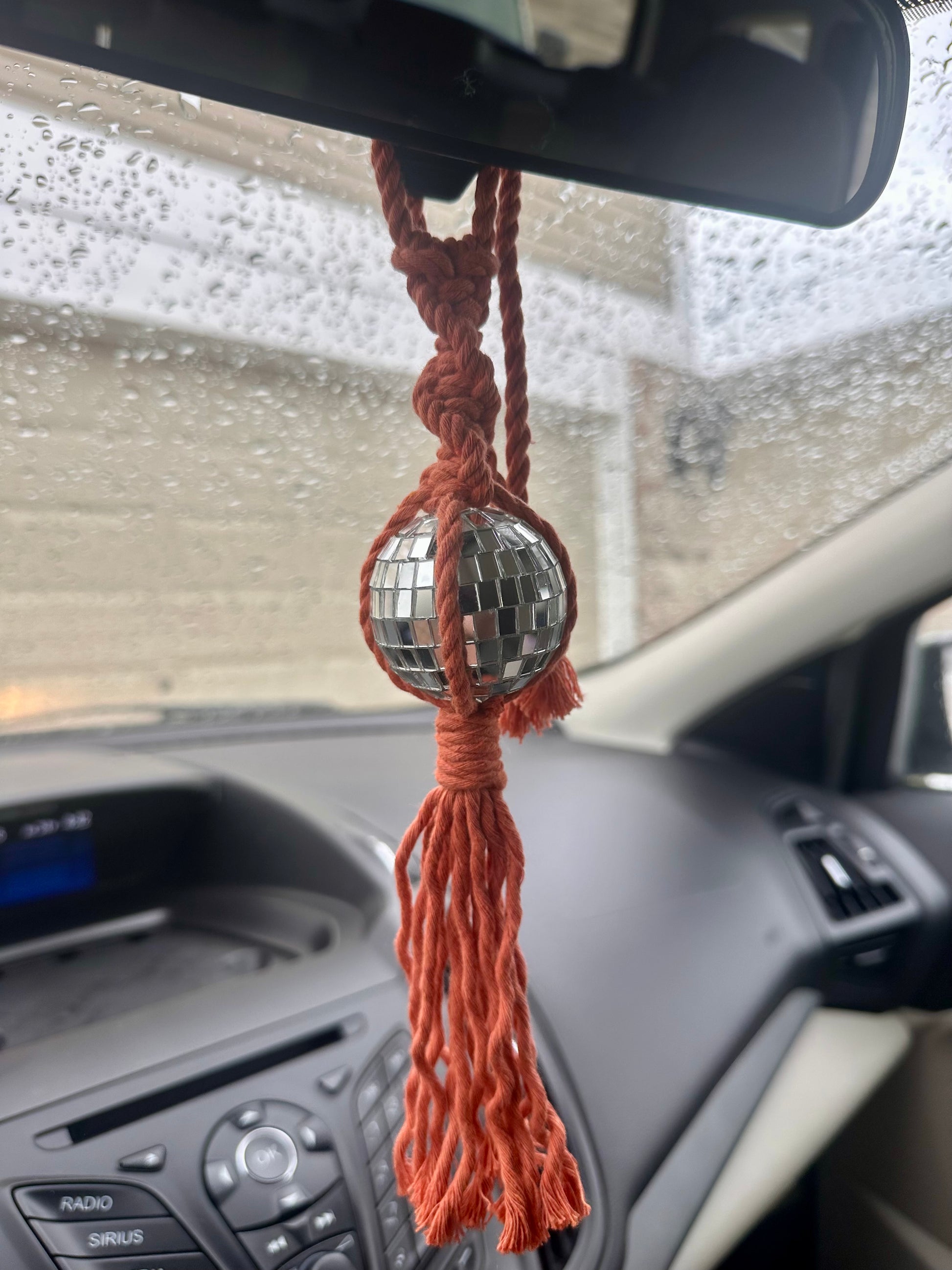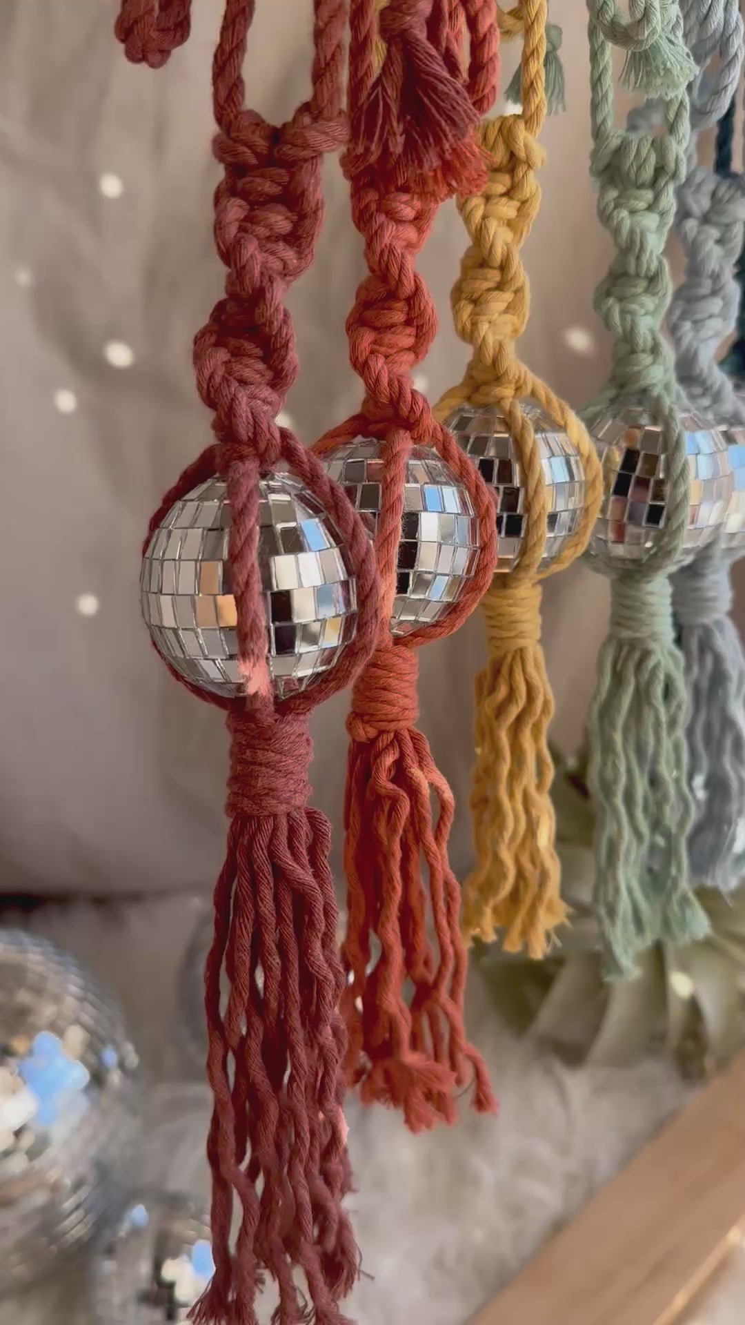 Add a groovy vibe to your ride and watch your car sparkle with these macrame disco ball charms. It can also be used as an accessory on your bag or keychain for extra style.