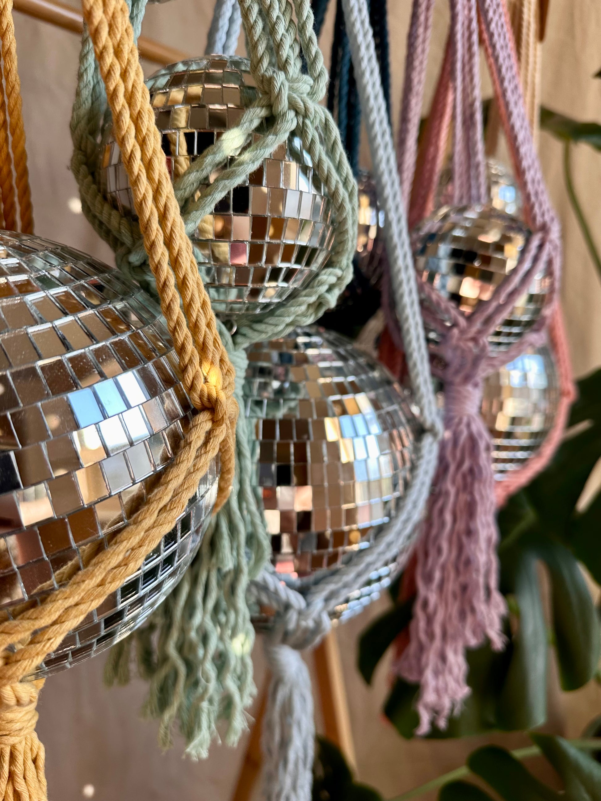The 8 in & 3 in disco ball combo with the macrame holder is really cool-looking. Beautiful job:)