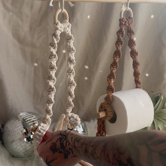 This bohemian macrame toilet paper or hand towel holder will be a beautiful addition to your bathroom. Easily switch out paper rolls by sliding the dowel. Use the wooden ring to add essential oils for an aroma diffuser.