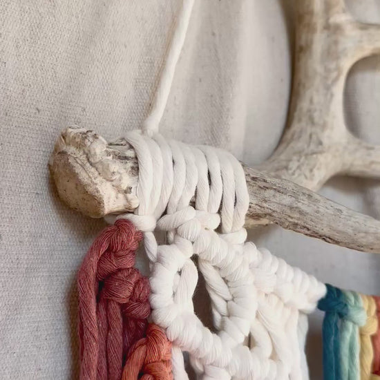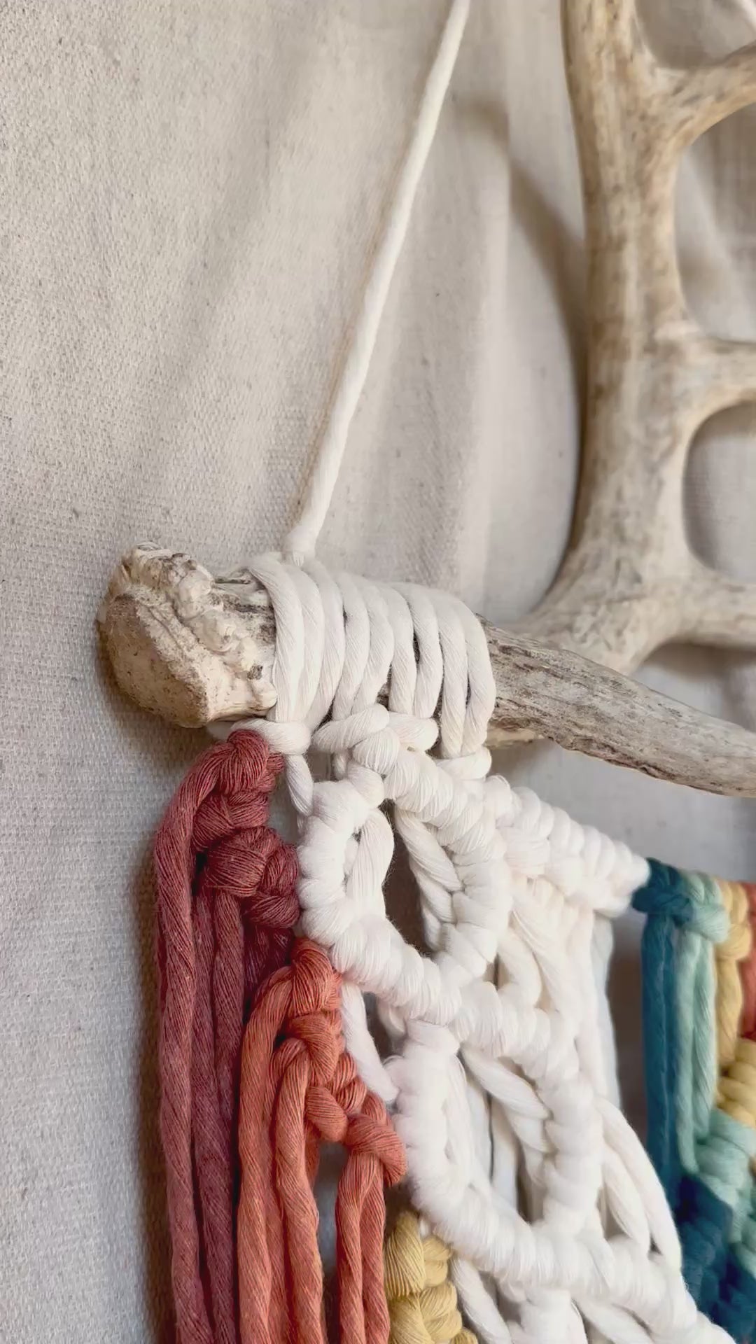 Bring some color into your space with this deer antler macrame wall hanging! Mounted with a clear quartz crystal, providing spiritual serenity and promoting positive energy. All of my crystals are hand-picked personally by me from a local crystal dealer and are cleansed with Palo Santo. A large airplant is included with this piece to bring it to life.